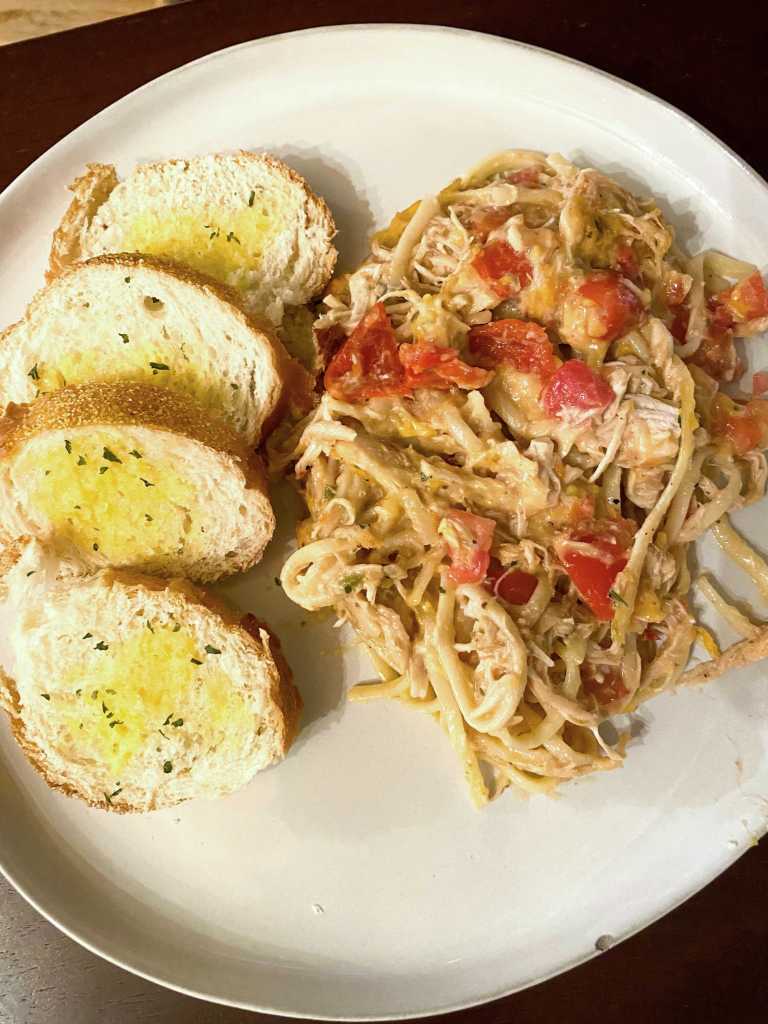 I cooked my chicken in the crockpot shredded, set aside. Cook and drain noodles. Mix noodles, chicken, cream of chicken, chicken broth, ranch seasoning together. Add the tomatoes and peppers. Can sub or add onions or peppers. Top with shredded cheese of your choice.